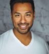 Vibrant hair dyed in shades of blue and purple, styled in a bob cut. A small portion is tied in a bun, and star-shaped black face tattoos are visible on the cheek.